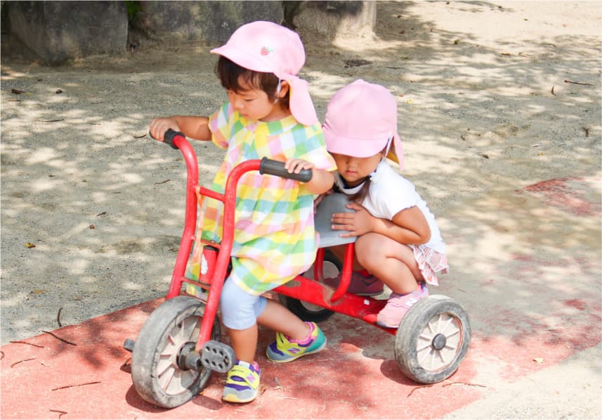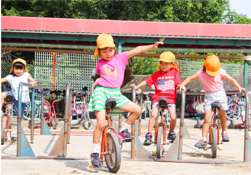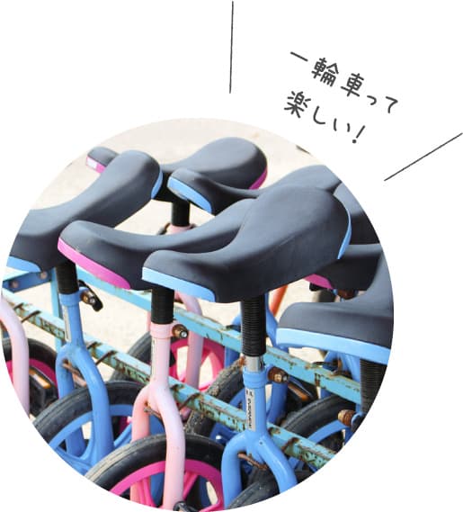 園にはたくさんの一輪車があり、園児の成長に合わせた多種多様な遊具で夢中になってあそんでいます。