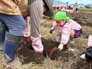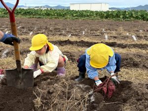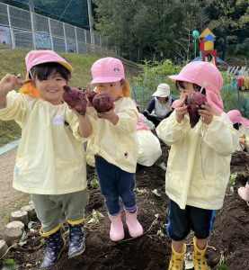 三つ子ちゃんのいもや、ふとっちょいも、ほそ〜いいも色々な形のいもが掘れました。大きいいもは嬉しいようで「見て!見て!」とみんなにみせてくれるお友だちもいましたよ。お家でお料理してね〜🍠