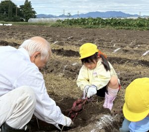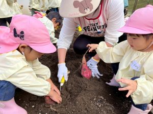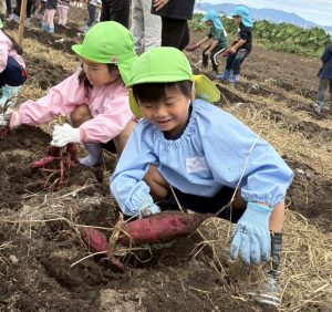 みんなが楽しみにしていたいもほりでした。朝から長靴、軍手を準備し「大きいおいもほる!」「早くやりたい!」と意気込んでいました💪🏻年長・年中は関市のふるさと農園へ、年少・満3歳児は園庭畑でいもほりをしました。